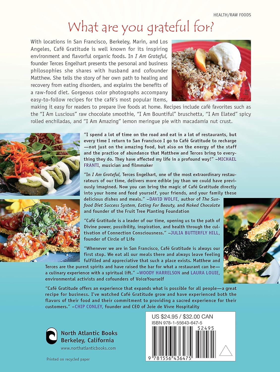 With locations in San Francisco, Berkeley, Marin, and Los Angeles, Café Gratitude has become well known for its inspiring environment and distinctive, flavorful organic foods. In I Am Grateful, cofounder Terces Engelhart presents her and her husband Matthew’s view of life and business philosophy. She also presents her story of personal healing, sharing highlights of her recovery from food addiction while explaining the benefits of a raw lifestyle. The book’s gorgeous, full-color photographs accompany easy-to-follow recipes for the café’s most popular items, making it easy for readers to prepare live foods at home. Recipes include café favorites such as the “I Am Luscious” raw chocolate smoothie, “I Am Bountiful” bruschetta, “I Am Elated” spicy rolled enchiladas, and “I Am Amazing” lemon meringue pie with macadamia nut crust.