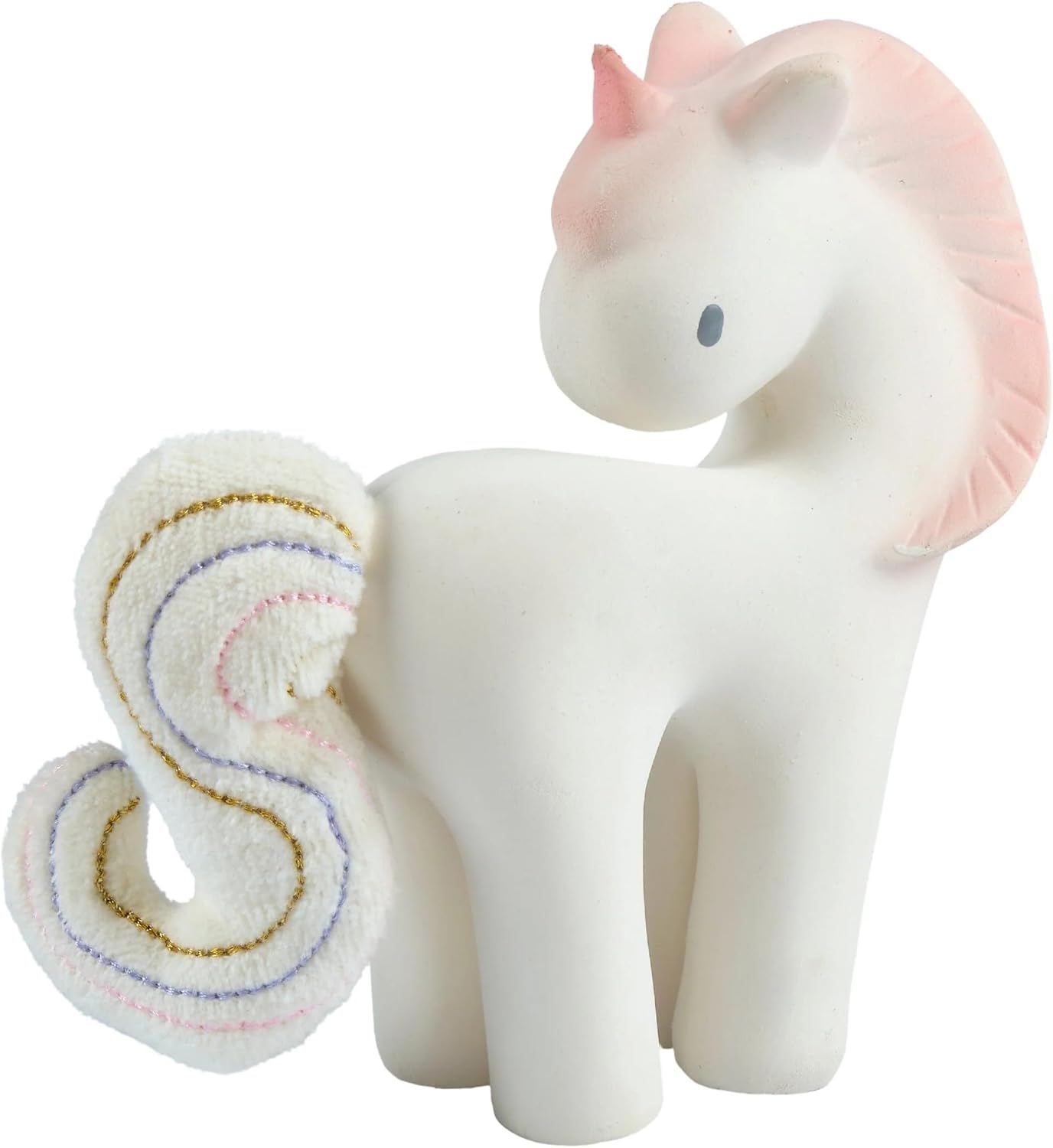 The Cotton Candy Unicorn in our Tikiri Fairytales Collection is a magical toy made from natural rubber, hand-painted with soy-based materials, and designed with features for baby stimulation.