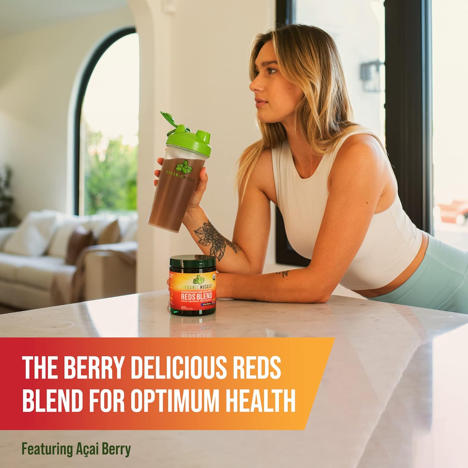 Organic Muscle Superfood Reds powder is a daily supplement that supports digestion, metabolism, and the immune system. Made with organic and non-GMO ingredients, it provides essential nutrients and vitamins without artificial flavors or sweeteners.